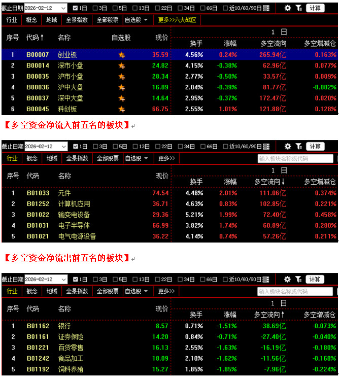 从板块资金动向数据来看,截止到今日收盘时,在资金流入榜上,元件板块以111.06亿的资金流入额位居榜首;其次是计算机应用板块,资金流入102.85亿;此外,输变电设备板块、电子半导体板块、电气电源设备板块也都相继上榜,三个板块的资金流入额分别为72.40亿、60.89亿、57.26亿;再看资金流出榜,银行板块引领做空,资金流出38.69亿;其次是证券保险板块,资金流出27.40亿;此外,百货零售板块、食品加工板块、饲料养殖板块的资金流出额也都相对较多,分列资金流出榜第三到第五名位置。综合比较后可知,今日不仅元件板块与计算机应用板块资金流入双双超过百亿,输变电设备、电子半导体、电气电源设备等板块的资金流入额也都在55亿之上,场内多方人气依然较高,全天资金流入超过10亿的板块多达19个;反观空方阵营,虽然银行板块与证券保险板块资金流出双双超过25亿,对大盘构成一定压制作用,但与多方力量相比,整体抛压力仍相对较小。从六大战区的情况分别来看,截止到今日收盘时,六个战区均为资金流入状态,其中不仅深中大盘战区与科创板战区资金流入双双超过120亿,创业板战区的资金流入额更是高达265亿。可见今日虽然大盘徘徊不前,但各战区均有资金积极进场加仓,说明目前多数投资者对后市依然十分看好。在这种情况下,行情在节前就很难出现大幅回落,而随着多方力量的不断积累,市场继续向上拉升的可能就会越来越大。所以只要春节长假期间没有出现重大利空,节后大盘就有望向4200点整数关口发起挑战。建议大家紧跟资金步伐,积极优选个股,择机介入。