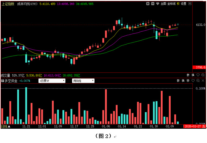 再看图2,今日大盘小幅高开,但多方并未大幅上攻,指数经过全天震荡后,最终收出一颗阴十字星。不难发现,近三天大盘走势基本相同,指数均是在5日成本均线上方窄幅震荡整理,虽然看似徘徊不前,但市场短期走势却一直保持在强势格局当中,所以只要节后多方继续发力,行情很有可能会继续向上拉升。从下方的多空资金来看,今日多空资金为流出状态,不过资金流出量明显小于昨日的资金流入量,所以并未对市场造成太大影响。明天就是春节长假前的最后一个交易日,按照交易规则,明天卖出的资金是无法当天转出的,所以在节前最后一个交易日,空方大幅施压的可能性很小,蛇年行情有望迎来完美收官。