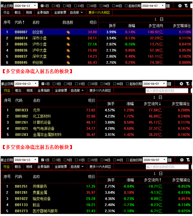 从板块资金动向数据来看,截止到今日收盘时,在资金流入榜上,元件板块以77.98亿的资金流入额位居榜首;其次是化工新材料板块,资金流入46.09亿;此外,计算机设备板块、电气电源设备板块、金属非金属新材料板块也都相继上榜,三个板块的资金流入额分别为45.17亿、37.37亿、36.22亿;再看资金流出榜,传媒服务板块引领做空,资金流出18.71亿;其次是贵重金属板块,资金流出9.13亿;此外,输变电设备板块、航运板块、医疗器械与服务板块的资金流出额也都相对较多,分列资金流出榜第三到第五名位置。综合比较后可知,今日不仅元件板块资金流入高达77亿,化工新材料、计算机设备、电气电源设备、金属非金属新材料等板块的资金流入额也都在35亿之上,从而有效地维持住了场内的多方人气,全天资金流入超过10亿的板块多达20个;反观空方阵营,只有传媒服务一个板块资金流出超过10亿,但与多方力量相比,整体抛压不大。从六大战区的情况分别来看,截止到今日收盘时,六个战区均为资金流入状态,其中不仅科创板战区资金流入超过70亿,创业板战区与深中大盘战区的资金流入额更是均在140亿之上。可见今日虽然大盘只是略有上涨,但资金却在积极进场加仓,所以整体上多方力量远远强于空方。在这种氛围下,投资者的做多热情就会继续保持在较高的水平,即便行情在短期内出现向下回探,空间也将十分有限。建议大家在控制好仓位的同时,可积极关注前期调整较为充分且近期有资金连续加仓的优质个股,逢低逐步吸纳。