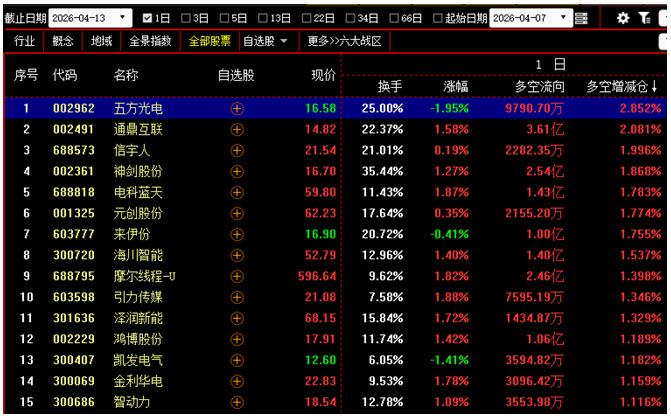今日两市上涨个股共2317只,其中涨幅超过3%的个股513只,涨幅在9.9%以上的个股76只;下跌个股共2720只,其中跌幅超过3%的个股287只,跌幅在9.9%以上的个股12只。图3所示为指南针特有的0Z指数K线图,从图中可以看到,今日0Z指数同样低开后出现回升,最终小幅收阳,收盘位置依然位于优化布林中轨上方。可见今日场内多数个股涨跌幅不大,市场整体基本处于原地踏步的状态。从下方的多空资金来看,今天多空资金为流入状态,但资金流入量较上周五有所减少,说明尽管多方在连续发力,但资金的进场力度有减弱迹象。在上周五的晚评中我们曾经提到,0Z指数2月2日的低点与3月4日的低点几乎处在同一水平线上,3月19日跌破该位置后,意味着上方筹码均已被套。目前这条水平线就在0Z指数上方不远处,若多方无法连续发力,将很难快速穿越前期的套牢筹码区,届时一旦空方趁机施压,行情就会再次出现反复。