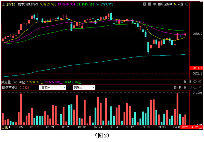 如图1所示,今日早间大盘低开,好在市场并未因此出现大幅下挫,指数只是略作下探后就开始逐步向上回升,虽然上攻的力度较弱,但午后大盘已经完全回补了早间的向下跳空缺口,并围绕着上周五的收盘点位展开窄幅震荡整理,指数最终以3988点收盘。从下方的多空资金来看,早间开盘后,多方就占据优势,随后资金逐步流入,多方优势不断增强。在这种情况下,市场自然就失去了持续杀跌的动能。可见虽然美伊谈判破裂,中东局势仍会动荡,但对A股的影响已经较之前明显减弱。所以接下来行情出现连续大幅回落的可能性较小,预计大盘在经过短期震荡整固之后,或有再次向上冲击4000点的可能。建议大家积极关注近期有资金连续大幅回流的板块,并在其中优选个股,逢低吸纳。
